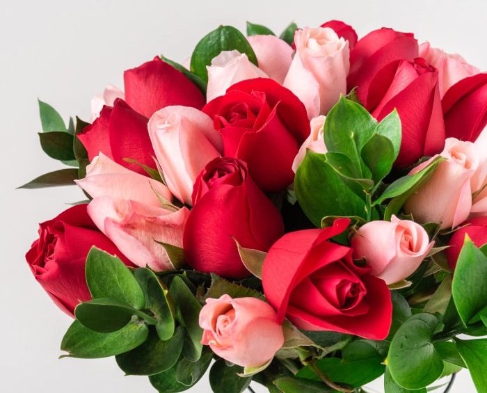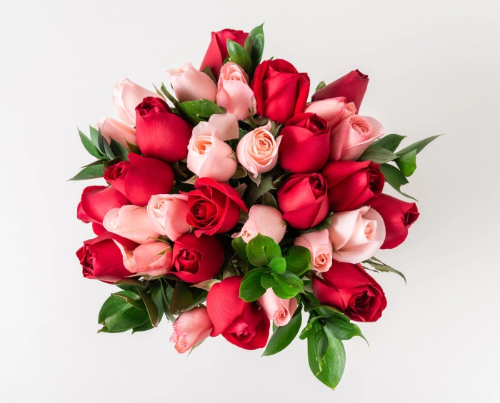 Combinação apaixonante para quem está apaixonado. O Buquê é confeccionado com 32 flores nacionais vermelhas e rosadas, com acabamento em ráfia e envolvidas em Ruscus e Tango.