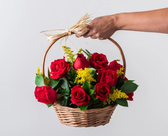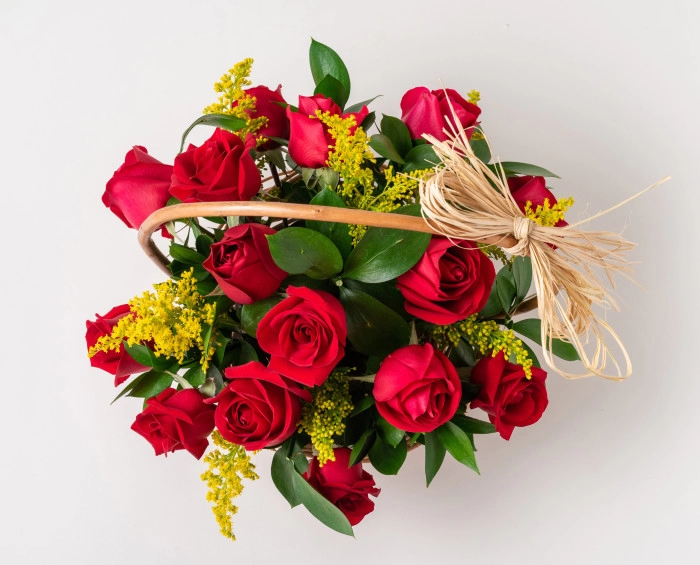 Esta cesta é a opção perfeita para presentear as pessoas mais queridas. São 15 belíssimas rosas vermelhas nacionais envoltas por ruscus e tango e com acabamento especial em ráfia. Acompanha ainda bombons Ferrero Rocher ou similares e uma garrafa de tinto de 750 ml.