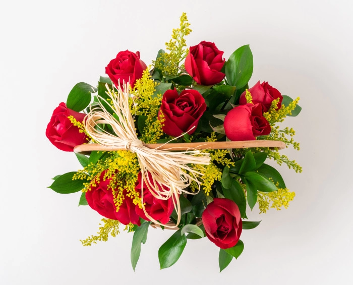 Uma bela cesta de flores feita com nove rosas vermelhas é perfeito para demonstrar o seu amor a uma pessoa muito especial. Para enaltecer esse sentimento, ela vem com chocolates e uma garrafa de espumante.