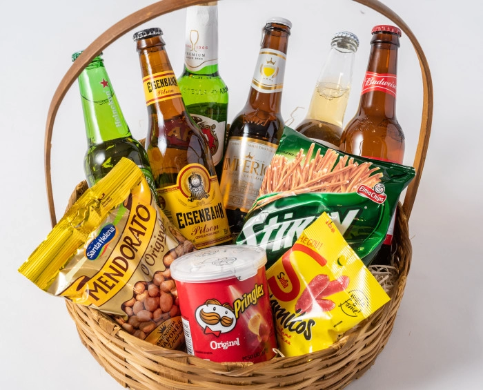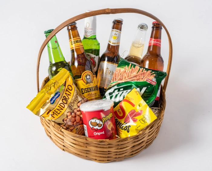 Cesta composta por seis cervejas variadas, com acompanhamento de petiscos como amendoim, salgadinhos, queijo e salamitos. Presente perfeito para surpreender, em momentos especiais.